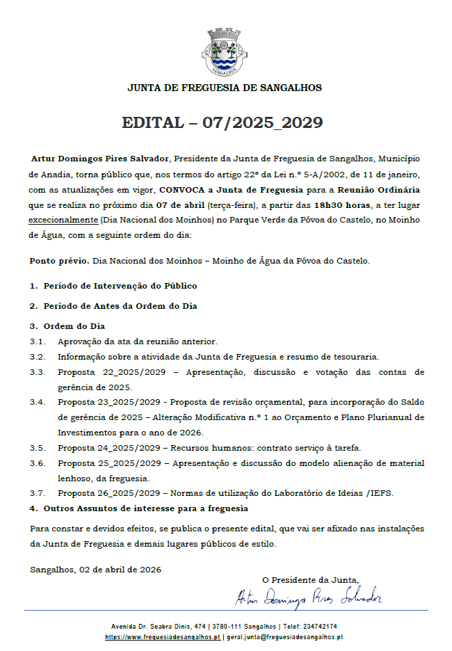 O Executivo da Junta de Freguesia de Sangalhos, vai reunir ordináriamente na proxima terça-fera, pelas 18h30, para tratar os assuntos que constam da agenda que aqui se divulga.